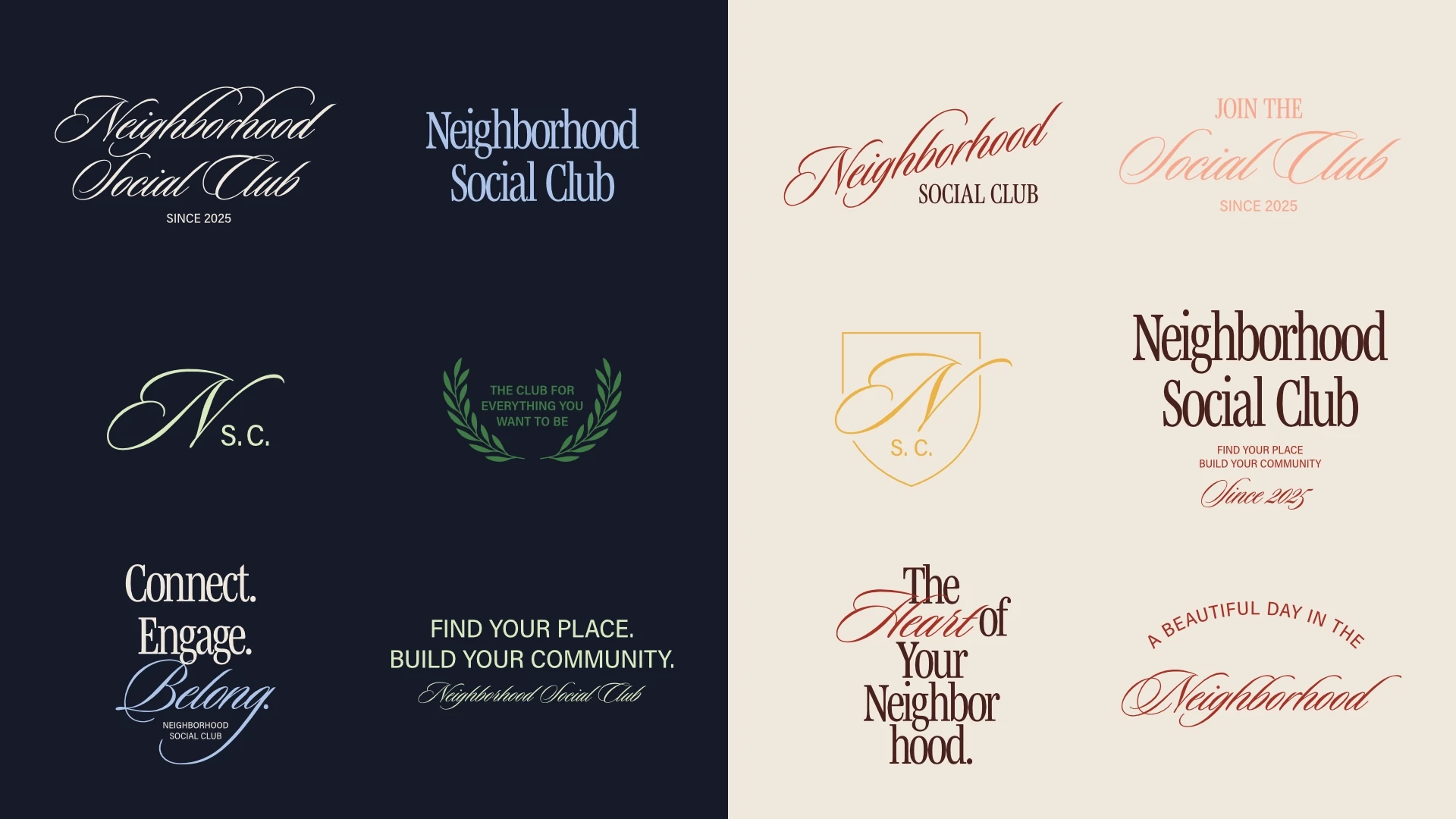 We positioned each property as its own neighborhood social club, pulling from vintage country club aesthetics that were having a moment. I worked with the creative team to develop a customizable visual system featuring two color palette options and a customizable crest library where communities could add their own logo and icons. For photography direction, we focused on authentic moments of togetherness — film grain, warm color grading, and genuine interactions.